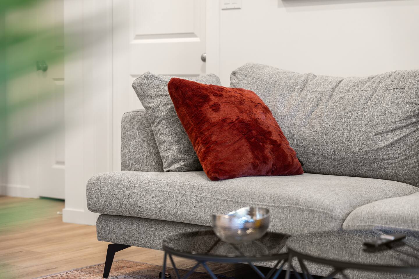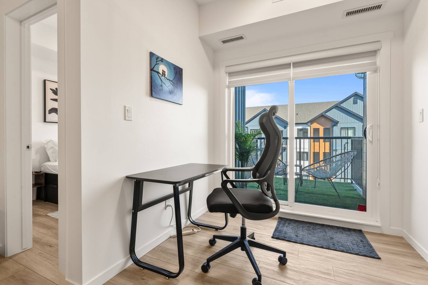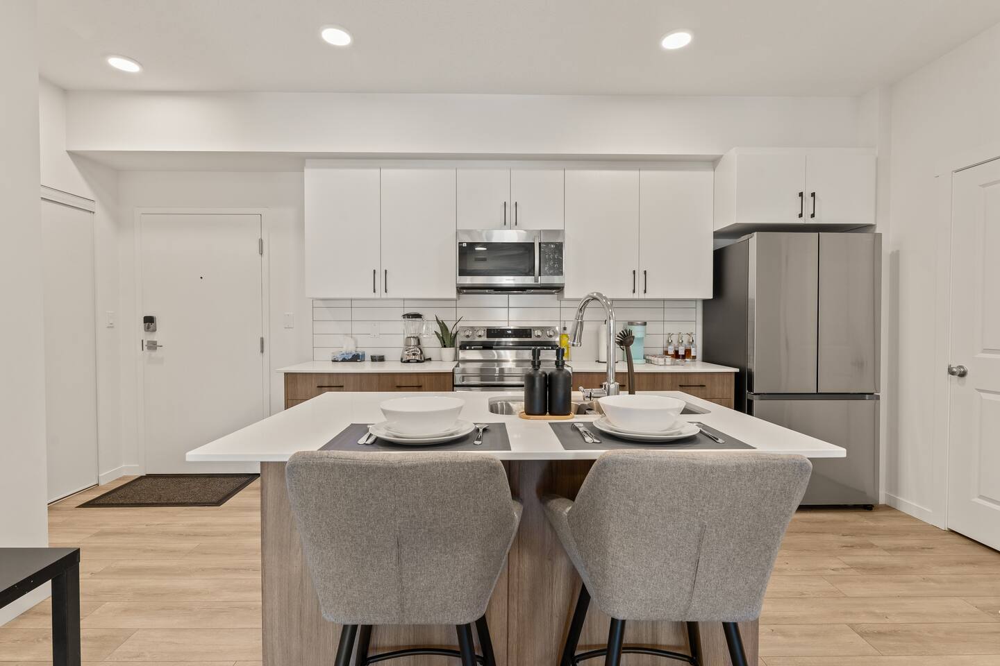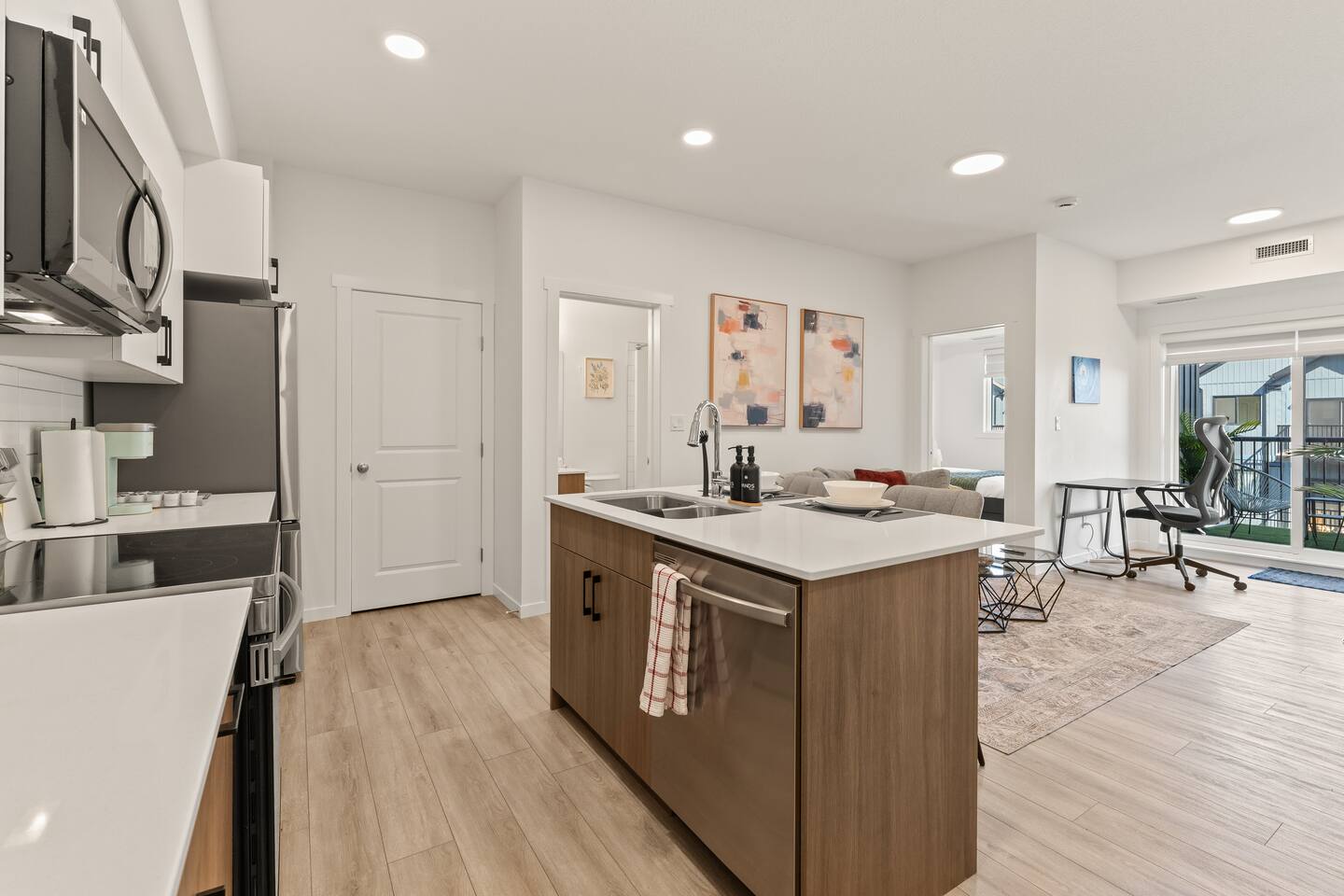 Step into a bright, contemporary space on the third floor, where designer touches and an open-plan layout create a welcoming atmosphere. The cozy living area, featuring a stylish gray sofa, is perfect for unwinding after a day of exploring. The sleek, fully stocked kitchen has everything you need to prepare your favorite meals. Each of the two bedrooms offers a comfortable queen-sized bed and its own TV for your entertainment. The modern bathroom provides the best of both worlds with a convenient walk-in shower and a separate bathtub for a relaxing soak. Need to catch up on work? You'll find a dedicated workspace ready for you. In the evening, enjoy the views from your beautiful private patio or put on a record with the in-unit player for a perfect, soft music evening.